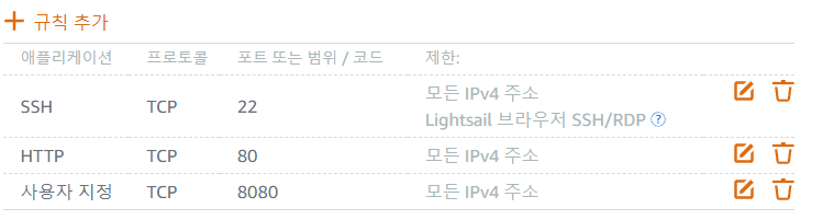 드디어 제대로 작동한다. 이제 이걸 웹이나 POSTMAN을 접근하기 위해서 규칙을 추가해줬다. 현재 스프링부트가 8080포트에서 돌아가고 있기 때문에 8080포트를 추가해주었다.